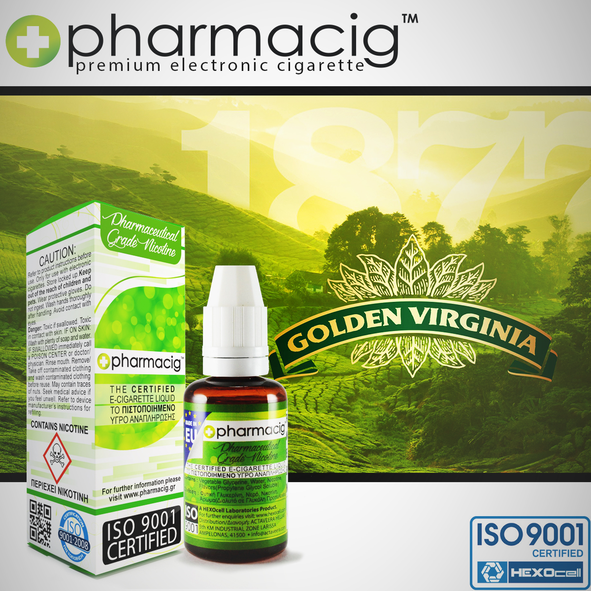 ISO 9001 Quality Certified European Product Pharmacig liquids are produced in the EU by HEXOcell Laboratories using the highest quality ingredients available.